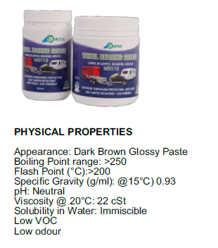 Lantos® Wheel Bearing Grease WB115 is designed for low load wheel bearings as used for boats, jet skis, domestic trailers, ride on mowers, buggy carts etc. When a trailer is left standing for wintering, WB115 Wheel Bearing Grease will not go hard and will go on protecting the bearing and seals. It acts as an anti-seize, corrosion inhibitor, and lubricant is salt, acid and alkali resistant and will continue to protect long after petroleum grade grease dries and will leave a natural protective film.