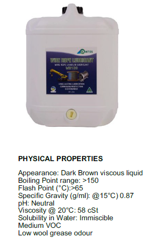 Lantos® Wire Rope Lubricant WR120 is a natural lanolin based mobile heavy fluid. Designed to give life to the wire rope, its working parts and allow traction to take place. Reduces metal-to-metal friction when the rope is operating under highpressure conditions and helps inhibit rust formation. It penetrates into the wire rope core, prevents internal rust, reducing rubbing wear and friction between individual strands.