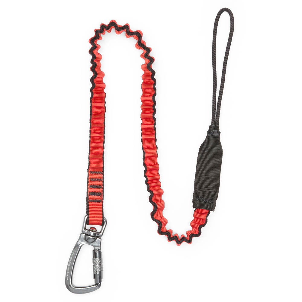 The Bungee Tool Lanyard with self-locking karabiner is manufactured from heavy duty elasticized webbing and includes a dual locking karabiner for maximum safety