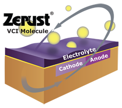 This technology is generally known in the industry as volatile or vapor corrosion inhibiting technology (“VCI”). Zerust VCI is primarily made of approved non-toxic and safe food preservatives. The Zerust chemical molecules are deposited from the Zerust packaging material onto the metal surfaces and form a powerful molecular layer that passivates the metal surface and protects it from corrosion. This layer is invisible, dry and does not affect the physical properties or functionality of the metal in any way. The protected metal can be painted, treated and/or used straight out of the Zerust package without further cleaning.