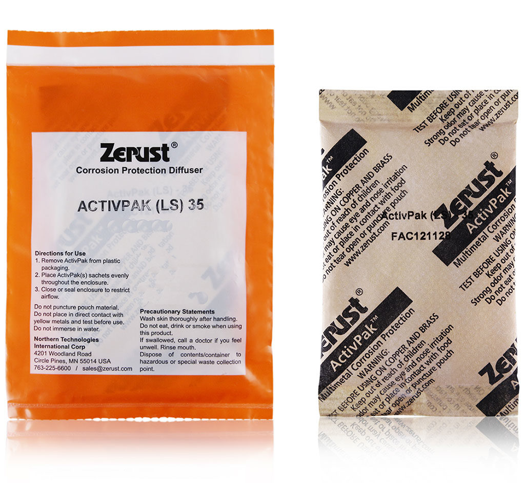 Zerust/Excor ActivPak(LS) packets offers a new technology of Vapor Corrosion Inhibitor (VCI) combined with Volatile Flash Corrosion Inhibitor (FCI™) to protect ferrous and aluminum metals in enclosed spaces. This combination goes to work in minutes to protect against both flash rust and long-term corrosion with its progressive VCI chemistry